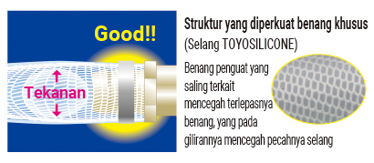 (2) Jangan digunakan pada air bersuhu tinggi di atas 100℃ (aplikasi pipa pengendali suhu,dll). Bahan penguat selang (benang) akan ringkih, dan selang akan robek, dikhawatirkan terjadi kecelakaan lanjutan seperti luka, terbakar, dsb.